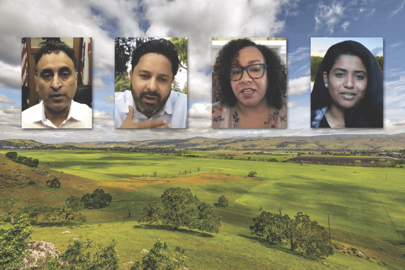 (Above, background): Coyote Valley in San Jose, Calif. (Santa Clara County Open Space Authority) (Inset, l-r): Assemblymember Ash Kalra; San Jose Councilmember Sergio Jimenez; Open Space Authority board member Shay Franco-Clausen; and director of community health, Trust for Public Land, Sadiya Muqueeth. (Siliconeer/Zoom screen grab)