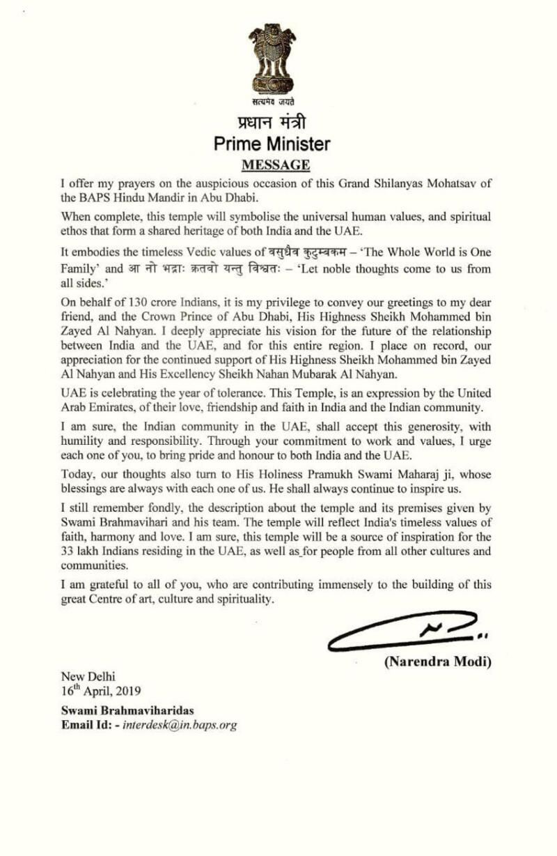 Indian Ambassador to the UAE His Excellency Navdeep Suri addressed the assembly, “It is an absolute honor to be in the midst of this journey which happens only once in a millennium.” He then read out a letter on behalf of Prime Minister Narendra Modi, which said, “When complete, this Mandir will symbolize the universal human values, and spiritual ethos that form a shared heritage of both India and UAE…. UAE is celebrating the Year of Tolerance. This Mandir, is an expression by the United Arab Emirates, of their love, friendship and faith in India and the Indian community.”