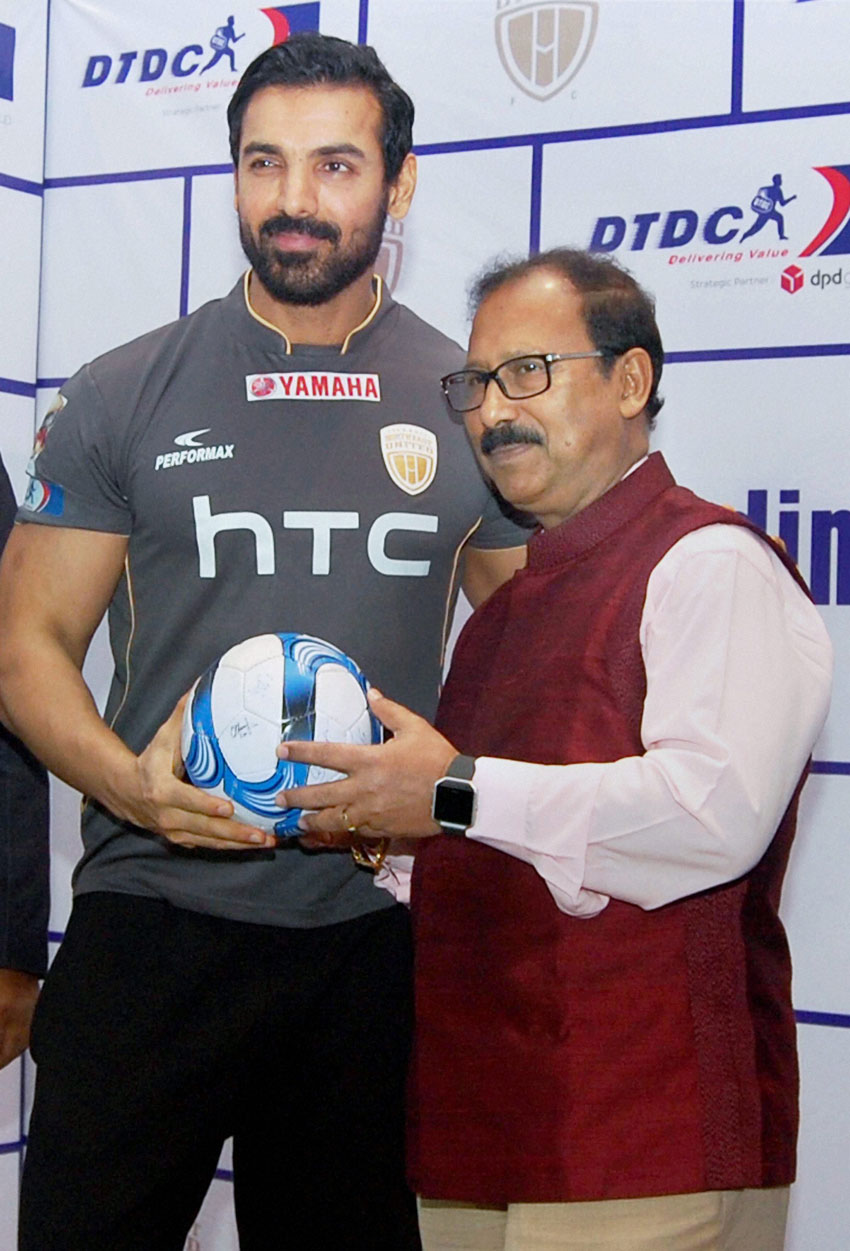 DTDC Chairman and Managing Director Subhasish Chakraborty presents a football to Bollywood actor and owner of North-East United Football Club (NEUFC) John Abraham during an event organized by DTDC in Guwahati, Nov. 30. (Press Trust of India)