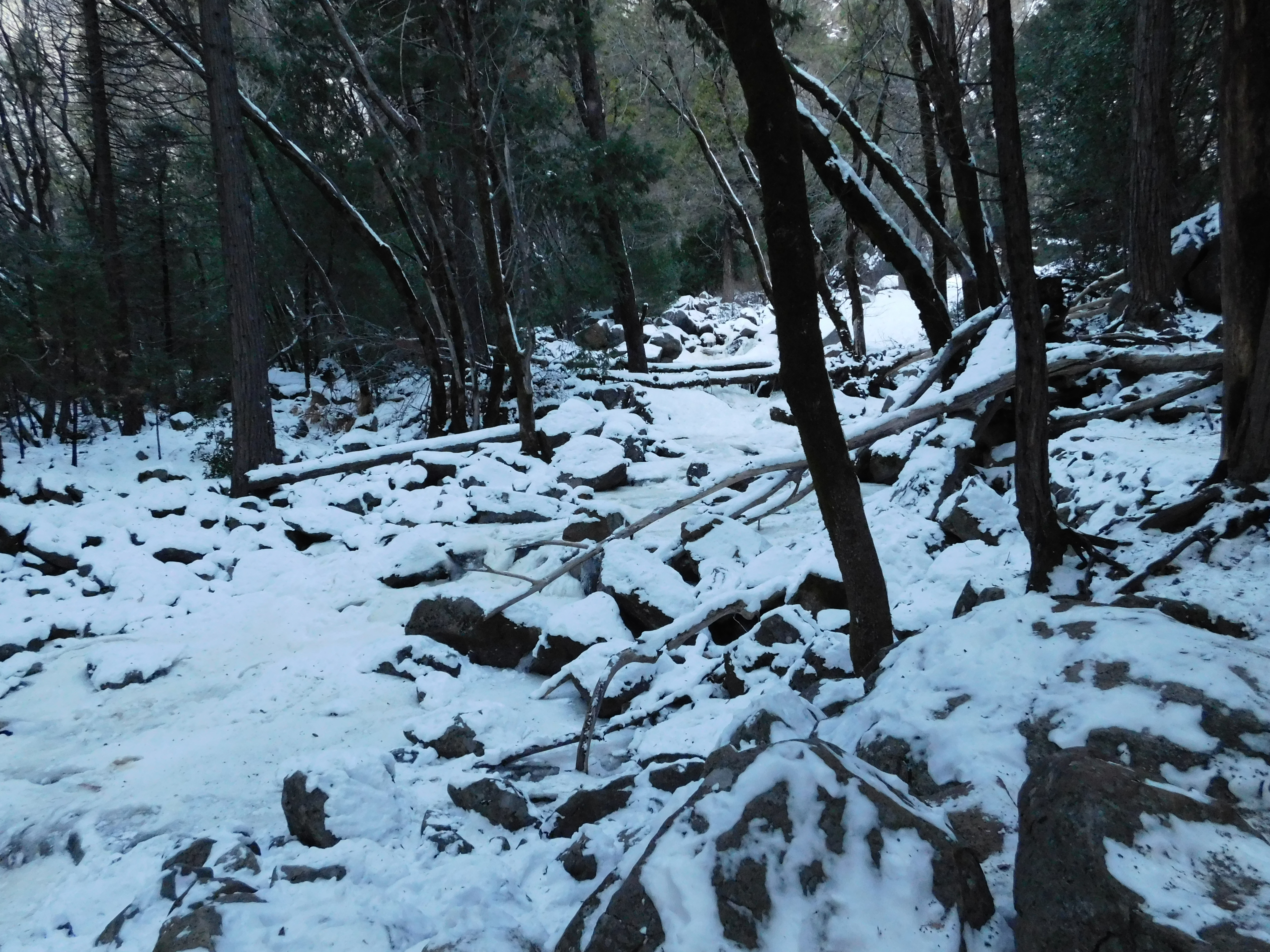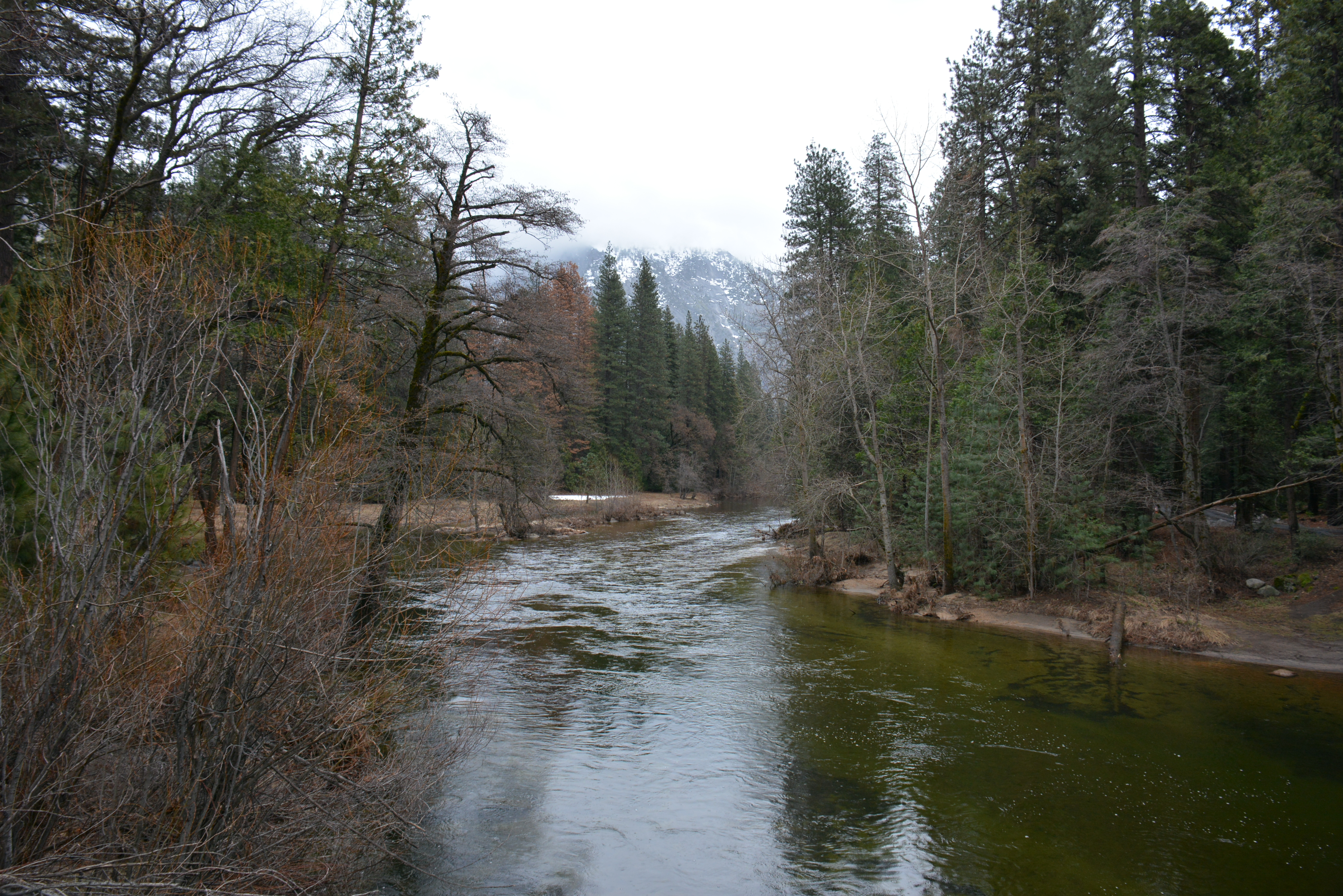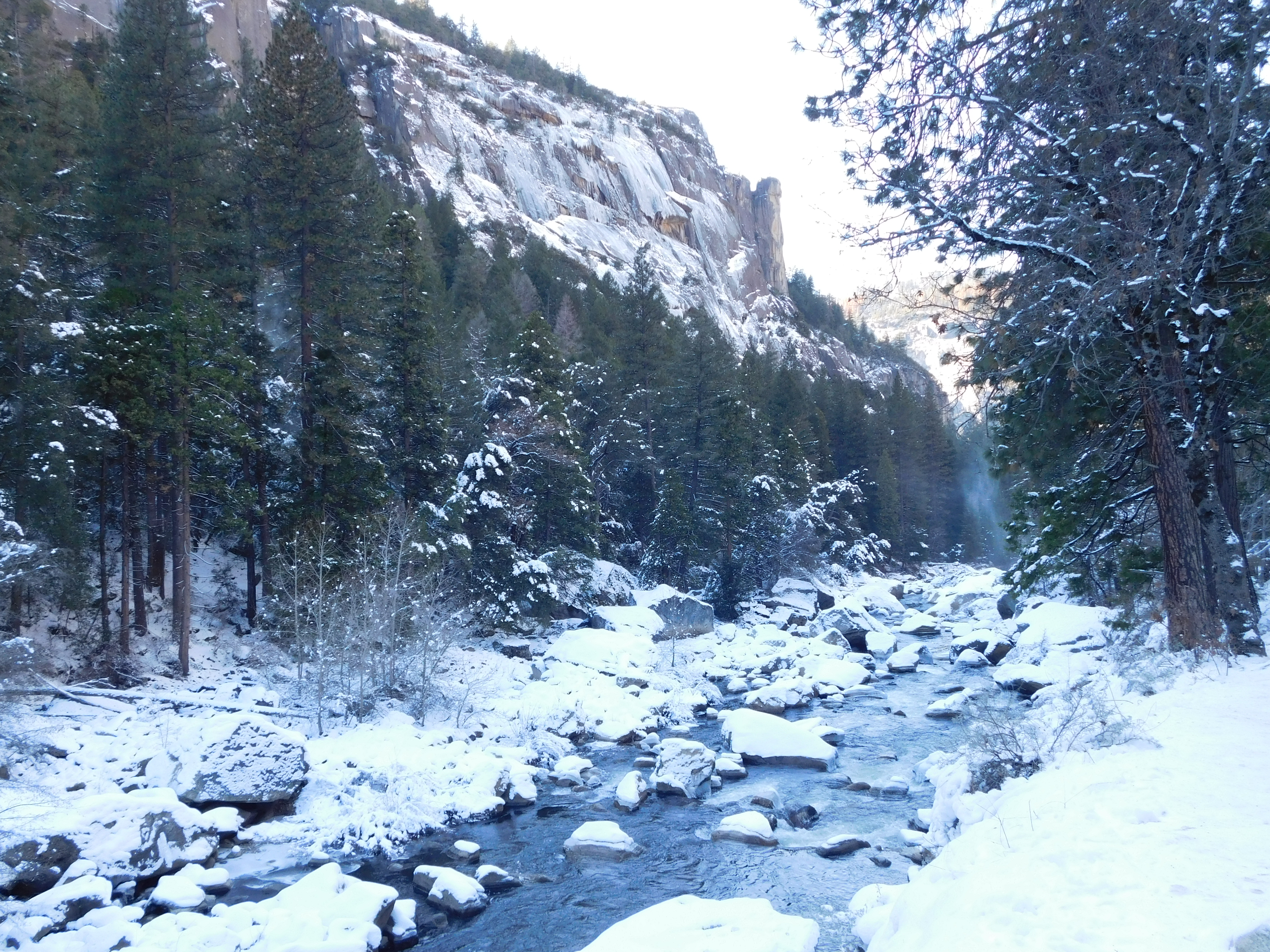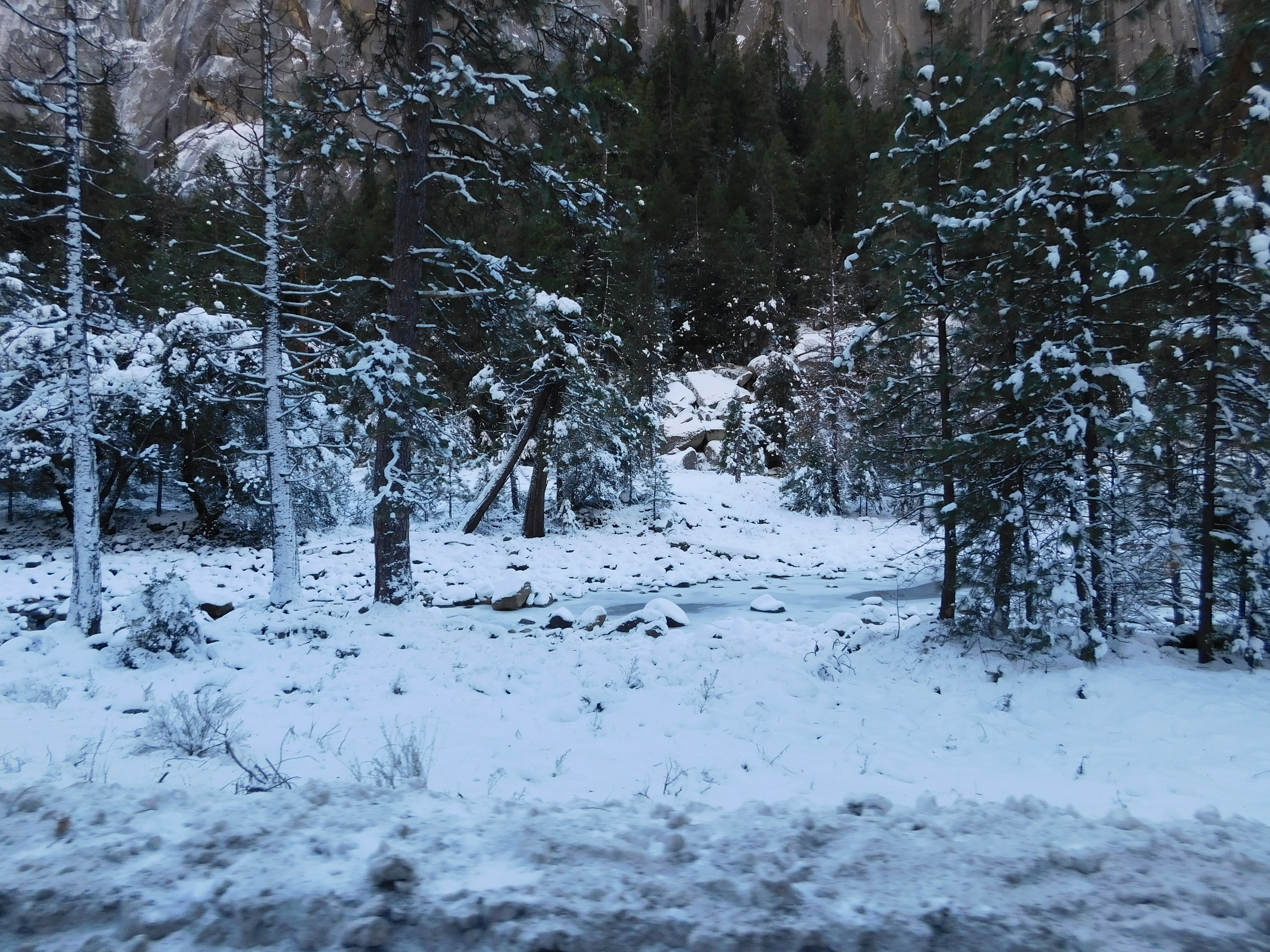 After a soaking, we made a beeline for our heated CUV and our trip advanced to the road circling the park until we trekked into the Sentinel Bridge with an overlook of the majestic Half Dome on one side and gushing Yosemite Falls on the other. Photos!