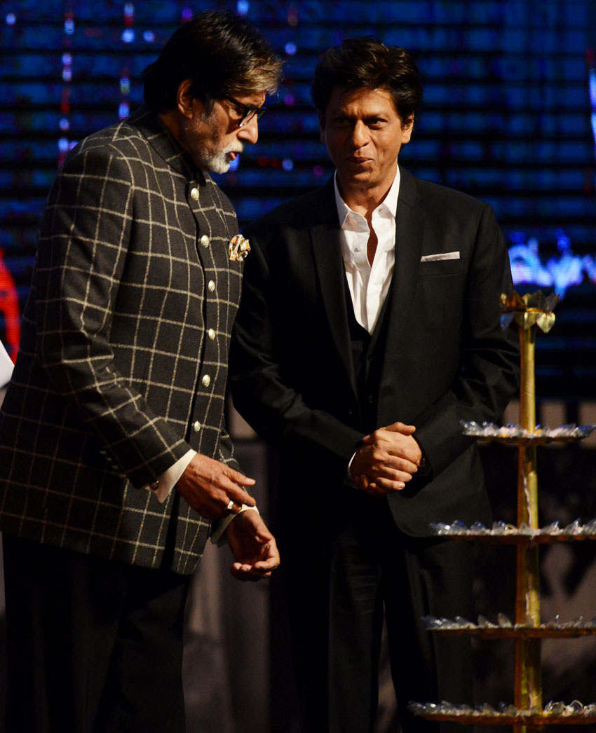 Indian Bollywood actors Amitabh Bachchan and Shah Rukh Khan (R) attend the inauguration of the 24th Kolkata International Film Festival in Kolkata on November 10, 2018. – More than 320 films from 70 countries screened during the seven-day festival. (Dibyangshu Sarkar/AFP/Getty Images)
