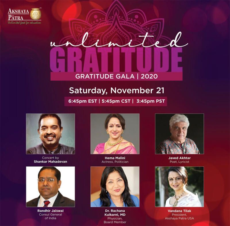 To close out the year, Akshaya Patra’s Gratitude Gala will be their seventh virtual gala. It will feature an incredible line-up of speakers such as Actress and Politician Hema Malini, Poet Javed Akhtar, Consul General of India Randhir Jaiswal, Dr. Rachana Kulkarni, MD, Cardiologist, and Akshaya Patra Board member. Also, guests will enjoy an exclusive concert by talented singer and composer Shankar Mahadevan.