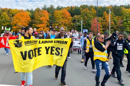 Amazon workers and supporters march during a rally in Castleton-On-Hudson, about 15 miles south of Albany, N.Y., Monday, Oct. 10, 2022. The startup union that clinched a historic labor victory at Amazon earlier this year is slated to face the company yet again, aiming to rack up more wins that could force the reluctant retail behemoth to the negotiating table. (Rachel Phua via AP)