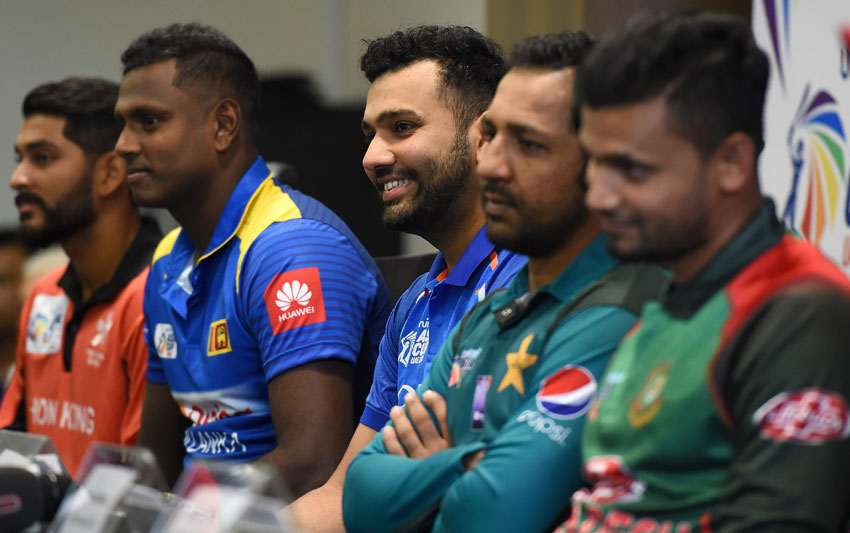 Indian cricket team captain Rohit Sharma (C) speaks during an Asia Cup press conference as Hong Kong cricket team captain Anshuman Rath (L), Sri Lankan cricket team captain Angelo Mathews (2L), Pakistan cricket captain Sarfraz Ahmed (2R) and Bangladesh cricket captain Mashrafe Mortaza (R) look on at the Dubai International Cricket Stadium in Dubai on Sept. 14, ahead of the start of the 2018 Asia Cup cricket tournament. (Ishara S. Kodikara/AFP/Getty Images)