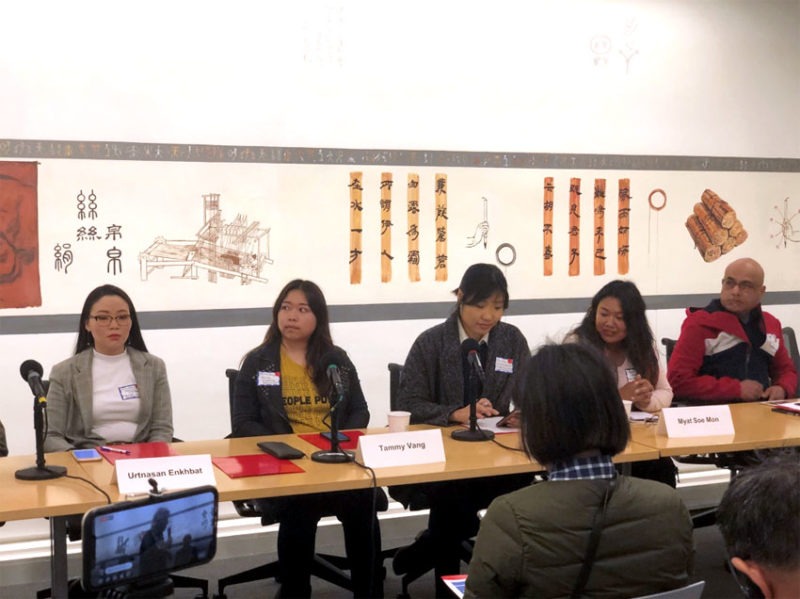 (Above, from l): Urtnasan Enkhbat, Tammy Vang, Yeri Shon, Myat Soe Mon and Ganesh Subedi, members of the second panel of speakers to address the importance of their communities being included in the 2020 Census, and some of the challenges standing in the way of obtaining a complete count, in a press briefing at Chinese for Affirmative Action, March 5 in San Francisco. (Nida Qasim Khan/Ethnic Media Services)