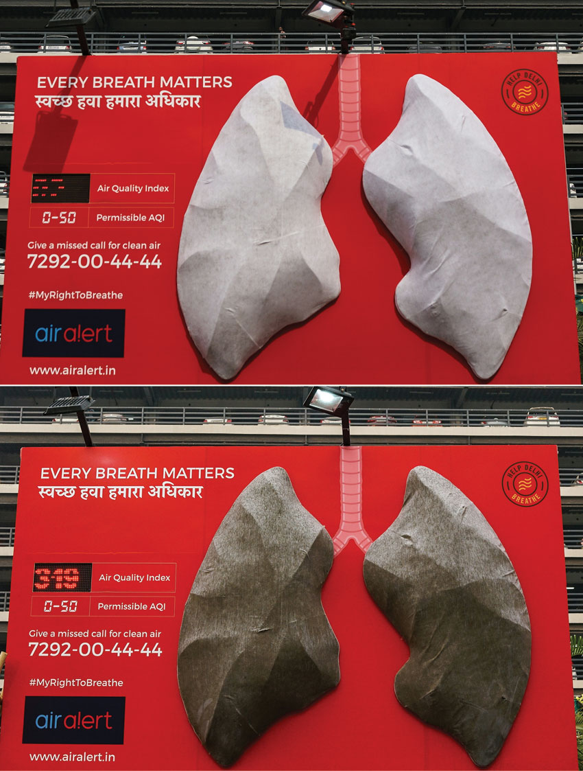 This combination of pictures created on November 13, 2018 shows (top) an installation depicting a giant set of lungs at Sir Ganga Ram hospital in New Delhi, Nov. 3; and (bottom) the same installation in New Delhi on Nov. 13, after 10 days exposed to the polluted air of the Indian capital. Smog kills more than one million Indians every year and Delhi has the worst air of any major city on the planet, the World Health Organization says. A giant pair of artificial lungs was set up outside the Sir Ganga Ram hospital and fitted with filters to demonstrate the damaging effects of smog in the Indian capital. (Chandan Khanna/AFP/Getty Images)