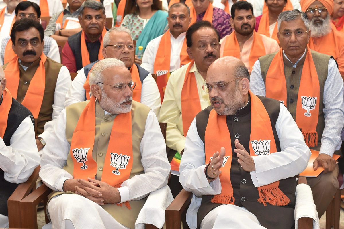 Prime Minister Narendra Modi and Amit Shah (r), during the BJP Parliamentary meeting at party headquarters in New Delhi, March 23. (Manvender Vashist/PTI)