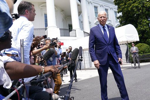 President Joe Biden walks past reporters as he heads to Marine One on the South Lawn of the White House in Washington, Friday, July 16, 2021, to spend the weekend at Camp David. (AP Photo/Susan Walsh)
