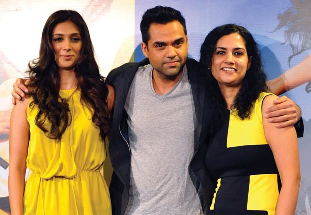 Abhay Deol (c) and Preeti Desai (l) pose during the launch of “One By Two” directed by Devika Bhagat (r) in Mumbai.