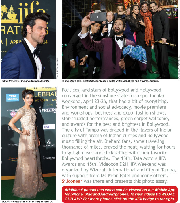 Politicos, and stars of Bollywood and Hollywood converged in the sunshine state for a spectacular weekend, April 23-26, that had a bit of everything. Environment and social advocacy, movie premiere and workshops, business and expo, fashion shows, star-studded performances, green carpet welcome, and awards for the best and brightest in Bollywood. The city of Tampa was draped in the flavors of Indian culture with aroma of Indian curries and Bollywood music filling the air. Diehard fans, some traveling thousands of miles, braved the heat, waiting for hours to get glimpses and click selfies with their favorite Bollywood heartthrobs. The 15th. Tata Motors IIFA Awards and 15th. Videocon D2H IIFA Weekend was organized by Wizcraft International and City of Tampa, with support from Dr. Kiran Patel and many others. Siliconeer was there and presents this photo essay.