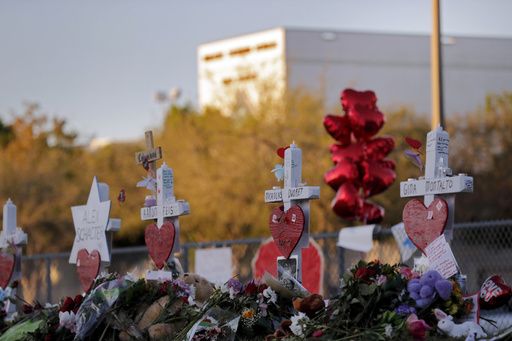 FILE – A memorial is made outside the Marjory Stoneman Douglas High School where 17 students and faculty were killed in a mass shooting in Parkland, Fla, Feb. 19, 2018. A California property manager was sentenced, Friday, Oct. 20, 2023, to a year in federal prison for sending more than 200 vile online messages to the father of a teenage girl who died in the 2018 massacre at Parkland’s Marjory Stoneman Douglas High School. (AP Photo/Gerald Herbert, File)
