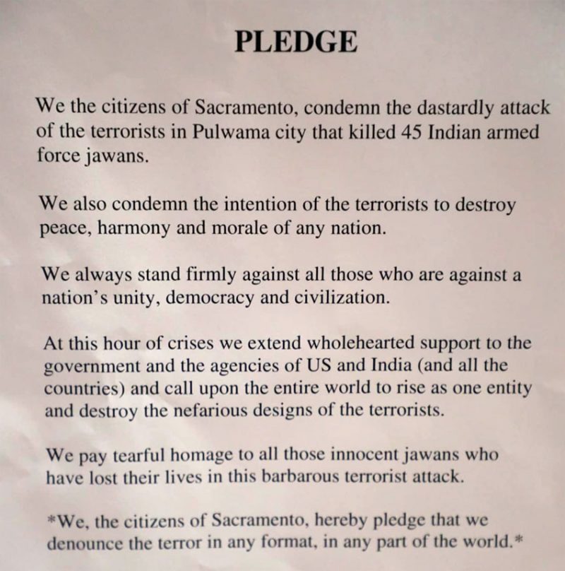 One of the guest speaker Sue Frost, Sacramento County Supervisor said, “tonight I attended a candlelight vigil sponsored by the Indian Association of Sacramento – and stood in solidarity with my fellow Sacramento region citizens and together we recited a pledge that ended with… ‘We, the citizens of Sacramento, hereby pledge that we denounce the terror in any format, in any part of the world’. It was a beautiful tribute to the honor the soldiers in the Pulwama terrorist attack by the Jaish-e-Mohammed group, in which over 44 CRPF personnel were killed and many others injured. Honestly… Words don’t come close to expressing the sorrow. Tonight, I am reminded of how lucky I am to live in America, the land of freedom and opportunity. I am grateful that I feel safe in my daily life. I pray for our friends in Pulwama.”