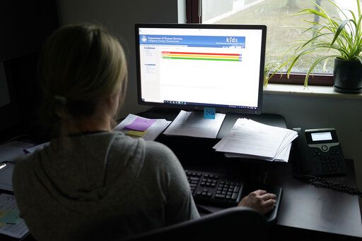 FILE – Case work supervisor Jessie Schemm looks over the first screen of software used by workers who field calls at an intake call screening center for the Allegheny County Children and Youth Services, in Penn Hills, Pa. The Justice Department has been scrutinizing a controversial artificial intelligence tool used by a Pittsburgh-area child protective services agency following concerns that it could result in discrimination against families with disabilities, The Associated Press has learned. (AP Photo/Keith Srakocic, File)