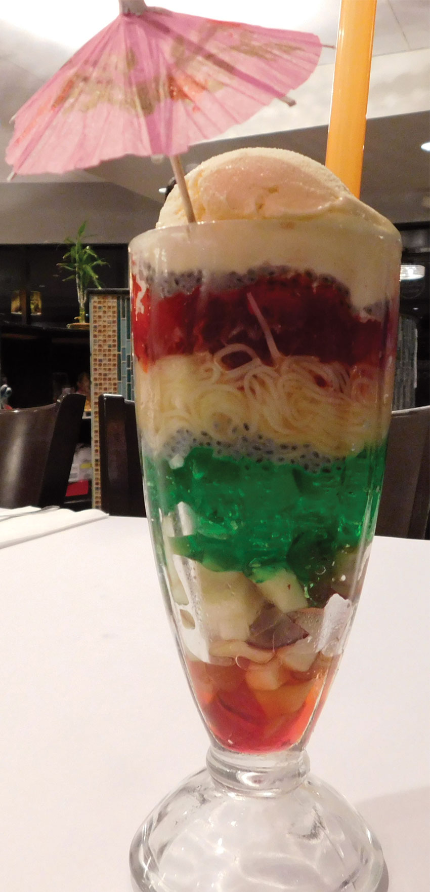 Falooda: The Falooda was one of a kind. It looked rather handsome and pretty with different colors and 7 layers of sweet indulgence. To just eat it without shooting a photo should be a crime. Some of the ingredients that stood out: Ice Cream, Apples, Red/Green Jelly, and Falooda noodles. This dessert is something that should not be missed.