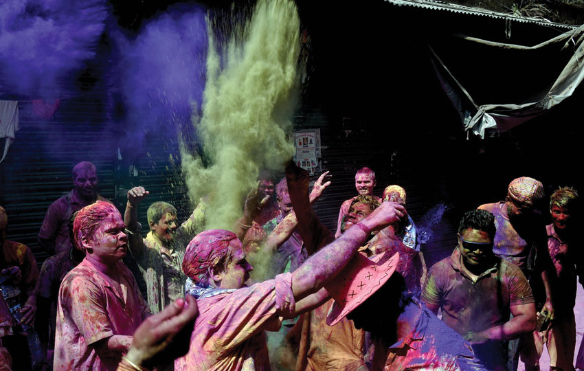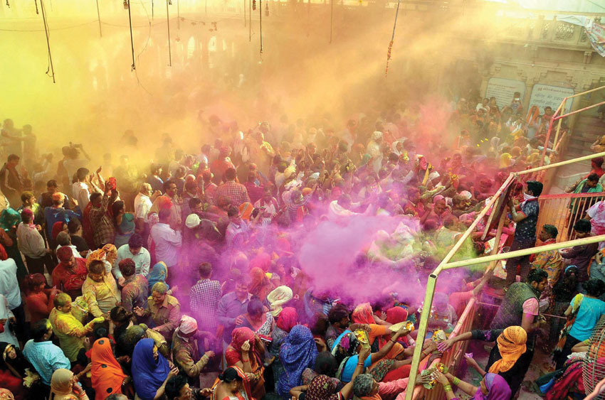 Devotees celebrate Ladoo Holi Festival playing with colors at Sriji temple in Barsana Dham, near Mathura, Uttar Pradesh, March 2. (K.K. Arora/PTI)