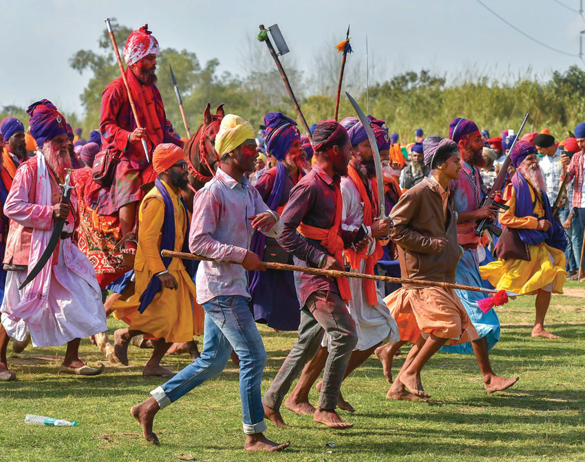 Sikh devotees and Nihangs (an armed Sikh warrior) take part in a procession during the annual fair of ‘Hola Mohalla’ at Anandpur Sahib, in Punjab, March 2. ‘Hola Mohalla’ or the festival of Nihangs is a gathering of Sikhs for military exercises and mock battles on the day following the festival of Holi. (Kamal Kishore/PTI)