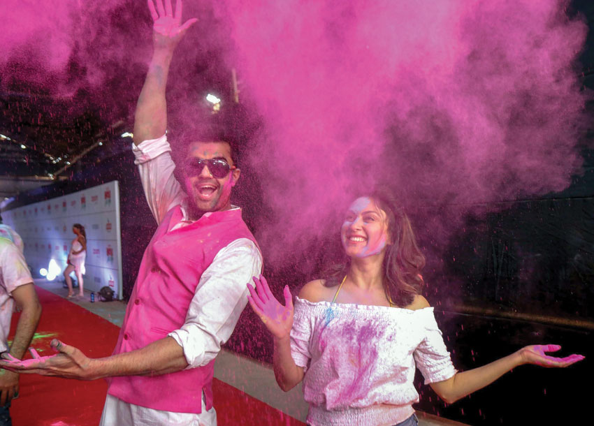 Bollywood actress Huma Qureshi with brother Saqib Saleem (l) celebrate Holi festival at Zoom Holi 2018 in Mumbai, March 2. (Press Trust of India)