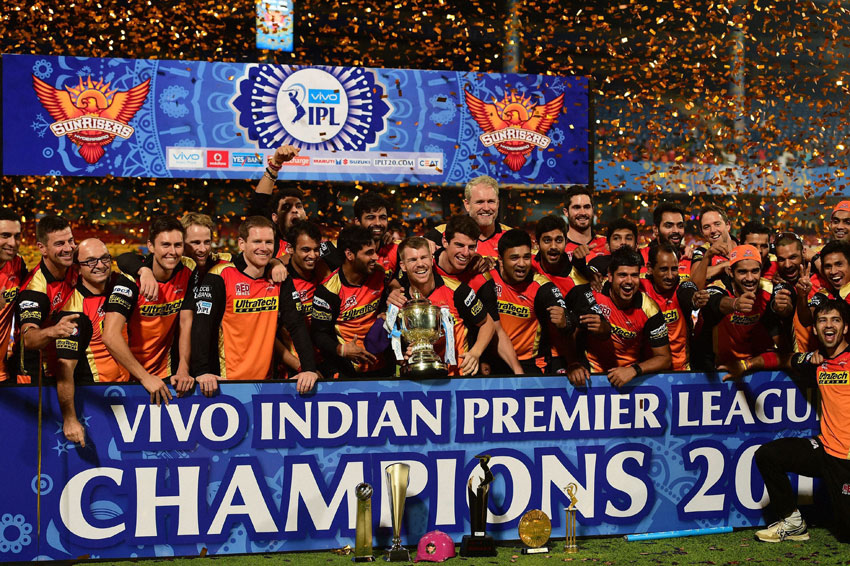 Sunrisers Hyderabad players celebrate with the winning trophy of IPL 2016 after beating Royal Challengers Bangalore in the final match at Chinnaswamy Stadium in Bengaluru, May 29. (Shailendra Bhojak | PTI)