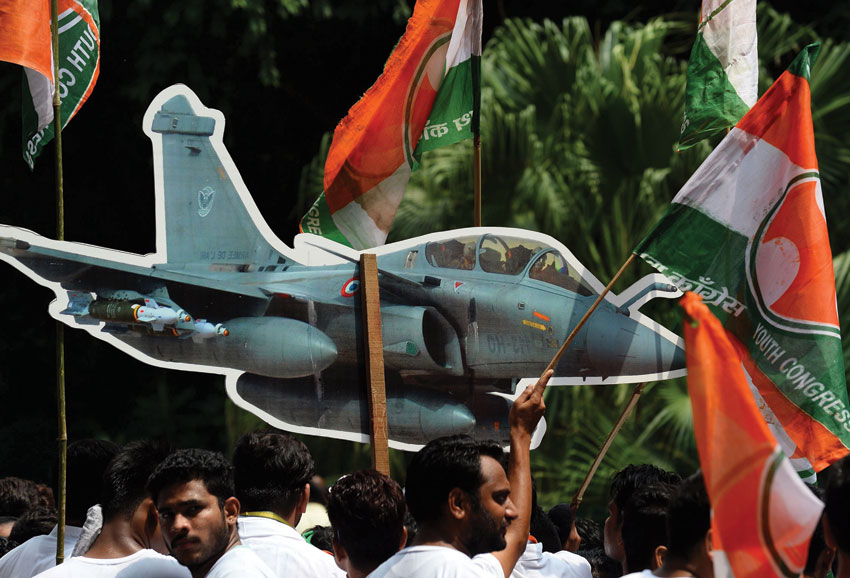 Supporters of the opposition Indian National Congress party hold a model of a Rafale fighter jet as they shouts slogans during a protest against the Rafale jets deal, in New Delhi, Aug. 30. The Rafale deal has been caught in a controversy with the opposition Congress alleging that the price being paid by the government to purchase 36 fighter jets is more that what it had negotiated for. The government has denied the allegation and refused to divulge the cost citing a confidentiality clause in the purchase agreement. (Sajjad Hussain/AFP/Getty Images)