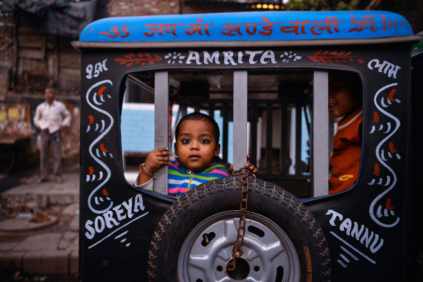 A young Indian child looks out from the back of an electric rickshaw in New Delhi, Dec. 1, 2016. (Chandan Khanna/AFP/Getty Images)