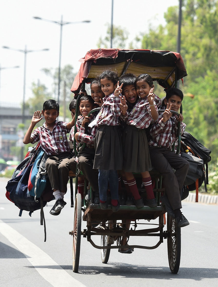 Indian school children gesture to greet while traveling on a over-loaded rickshaw on their way back home after their school in New Delhi, May 4, 2018. (Prakash Singh/AFP/Getty Images)