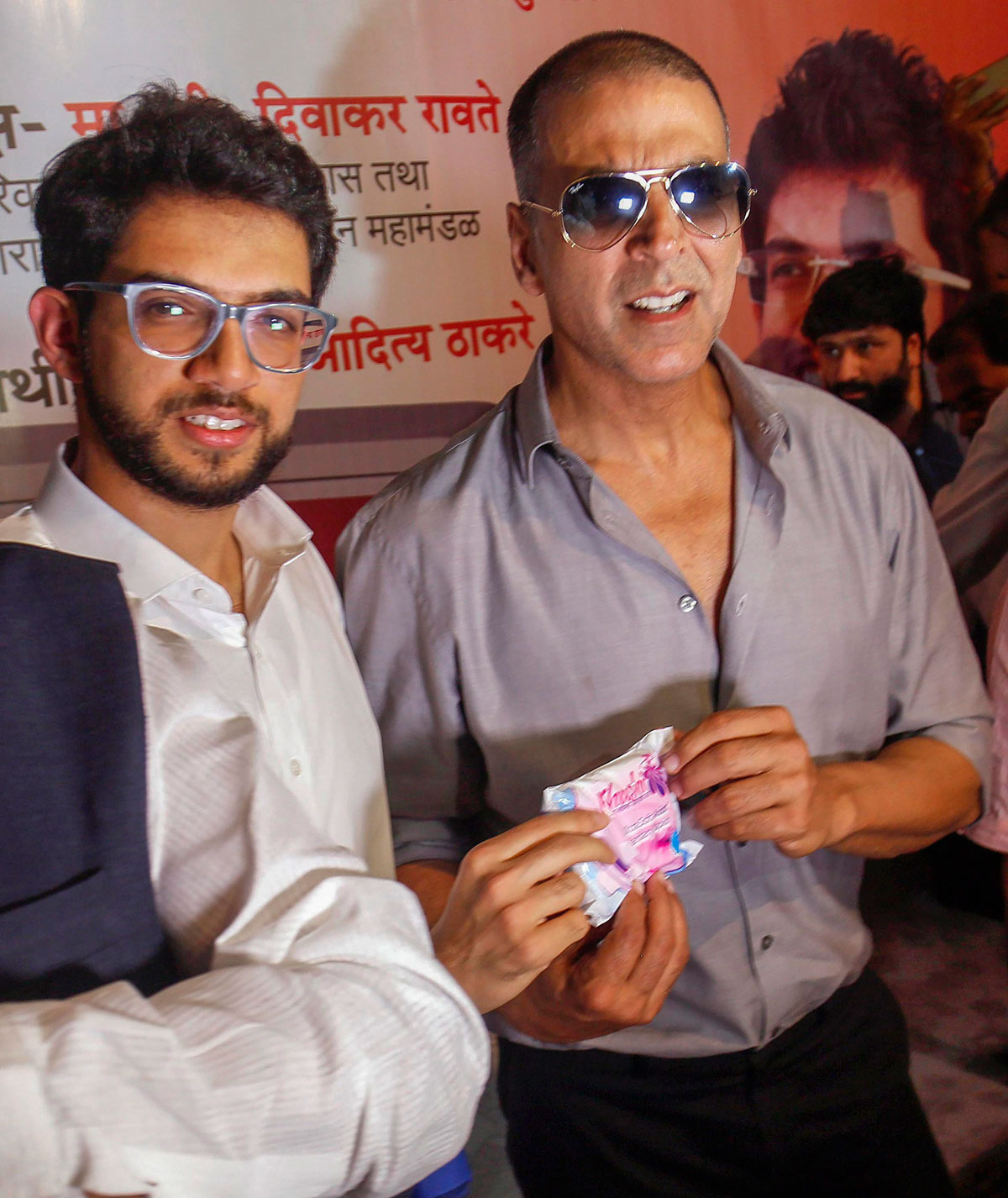 Akshay Kumar with Yuva Sena Chief Aaditya Thackeray (l) at the launch of sanitary napkin machine for women at ST. bus stand in Mumbai, Feb. 15. (Press Trust of India)