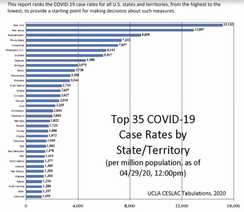 Hayes-Bautista also highlighted the findings of the Center’s new study which identifies the metric for evaluating the spread of the virus to determine whether states should re-open. Rather than looking only at the number of new cases, the Center ranks states by the number of infections per one million residents. By this metric, New York and New Jersey are in the top tier,with 15, 132 per million and 12, 907 per million respectively.   Two states where protesters are pushing aggressively to reopen – Louisiana and Michigan – rank sixth and ninth on the Center’s list, with 5,917 per million and 3,975 per million respectively.  California ranks 35th, with 1,195 infections per million.  (https://bit.ly/2Sx6HvC)