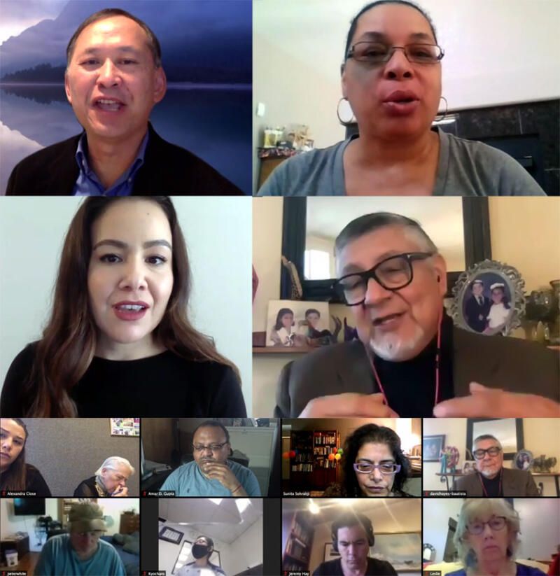 (Ab0ve): Dr. Tung Nguyen, a professor at the Health Division of General Internal Medicine at the  University of San Francisco; Melva Thompson-Robinson, director of the Center for Health Disparities Research at the University of Nevada, Las Vegas; David Hayes-Bautista, director of the Center for the Study of Latino Health and Culture at UCLA; Mayra Alvarez, president of the Children’s Partnership; and members of the ethnic media at a Zoom conference held, May 1, by Ethnic Media Services. (Siliconeer/Zoom screen grab)