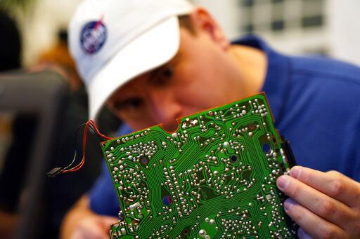 A volunteer repairs a circuit board at a fortnightly repair cafe event in Malmo, southern Sweden, Sunday Nov. 14, 2021. A global network of free-of-charge repair, made by non-professionals with a bug for fixing things, comes at a time as many electronics and white goods are discarded although they could be fixed. The shops, the so-called Repair Cafes, are part of an international grassroot network calling for the “Right to Repair.” (AP Photo/James Brooks)