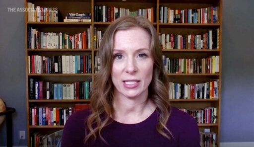 FILE – In this file image taken from video, Monika Bickert, Facebook’s head of global policy management, speaks during an interview with The Associated Press, Wednesday, Oct. 6, 2021. (AP Photo/File)