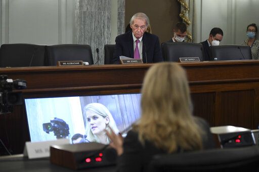 Sen. Ed Markey, D-Mass., questions former Facebook data scientist Frances Haugen speaks during a hearing of the Senate Commerce, Science, and Transportation Subcommittee on Consumer Protection, Product Safety, and Data Security, on Capitol Hill, Tuesday, Oct. 5, 2021, in Washington. (Matt McClain/The Washington Post via AP, Pool)