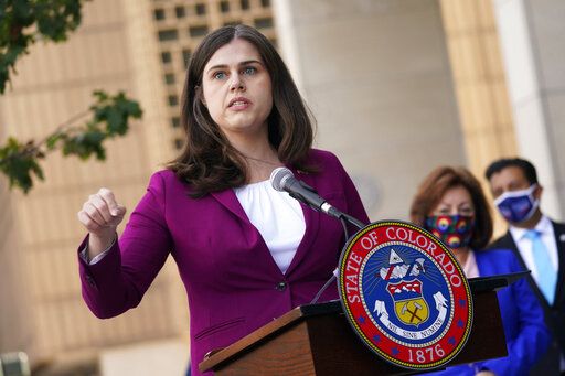 FILE – In this Oct. 15, 2020, file photo, Colorado Secretary of State Jena Griswold speaks during a news conference about the the state’s efforts to protect the process of casting a vote in the general election in downtown Denver. Griswold accused Mesa County’s election Clerk Tina Peters of directing staff to turn off video surveillance of voting equipment before a May 25, 2021, software update. Griswold also says Peters allowed a non-employee into the elections office during the highly secure software update. (AP Photo/David Zalubowski, File)