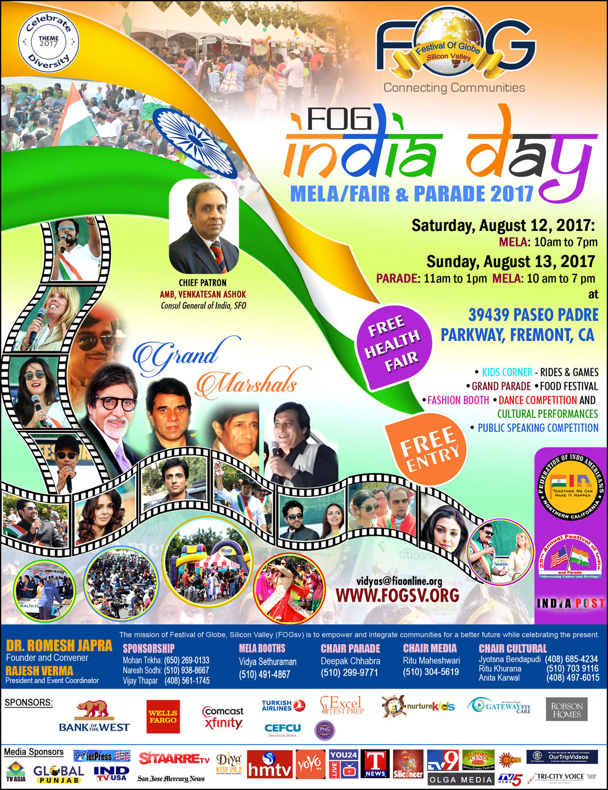Festival of Globe (FOG) Extravaganza is a 9-day jubilant celebration starting from Aug 5th to 13th, 2017 in the Silicon Valley and will include FOG Movie Fest, FOG Awards, FOG Music Fest, FOG Summit, FOG Fashion Fest, FOG Food Fest, Famous India Day Fair and Grand Parade. This year promises to attract a large gathering in the Bay Area.