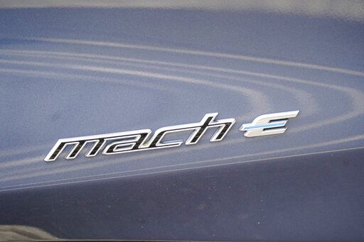 FILE – In this photo made on Thursday, May 6, 2021, the badging logo is seen on a 2021 Ford Mustang Mach E at a Ford dealer in Wexford, Pa. Ford is cutting prices on its Mustang Mach-E electric SUV by as much as $6,000 just weeks after market leader Tesla made similar moves. The company says in a statement, Monday, Jan. 30, 2023, that it’s increasing production of the Mach-E this year and is taking advantage of streamlined costs to reduce prices across the board. (AP Photo/Keith Srakocic)
