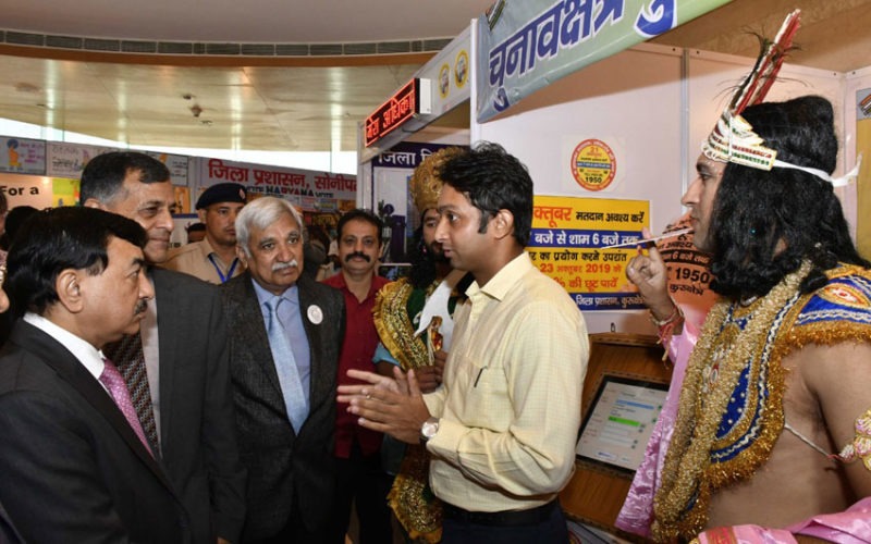 Chief Election Commissioner Sunil Arora along with the Election Commissioners Ashok Lavasa and Sushil Chandra visiting the state-level exhibition organized under the “Systematic Voter Education and Electoral Participation Program” (SVEEP), in Chandigarh, Oct. 10. (PIB)