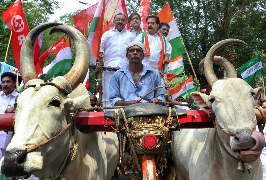 Congress leader Shashi Tharoor flanked by KPCC president M.M. Hassan (l) and opposition leader Ramesh Chennithala ride on a bullock-cart during a rally to protest against the hike in prices of gasoline and diesel, in Thiruvananthapuram, May 2. (Press Trust of India)