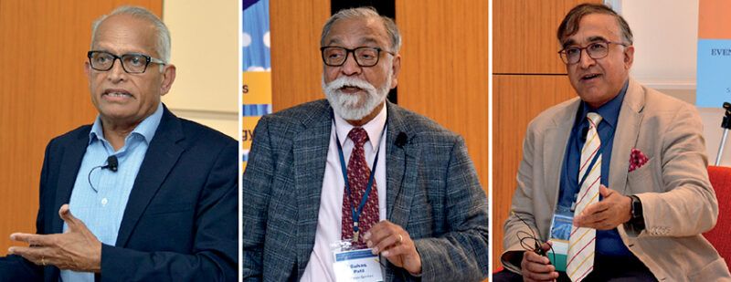 (L-r) Dr. Chandrakant Patel presenting his vision for cyber-physical engineering, Dr. Suhas Patil sharing his journey as a “misfit” entrepreneur who revolutionized chip design, Dr. Ronjon Nag discussing the intersection of AI and biology in longevity research at the South Asian legends panel (Vansh A. Gupta/Siliconeer).