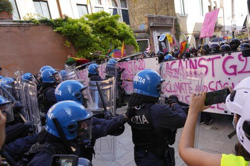 Italian Policemen in riot gears clash with demonstrators during a protest against the G20 Economy and Finance ministers and Central bank governors’ meeting in Venice, Italy, Saturday, July 10, 2021. (AP Photo/Luca Bruno)
