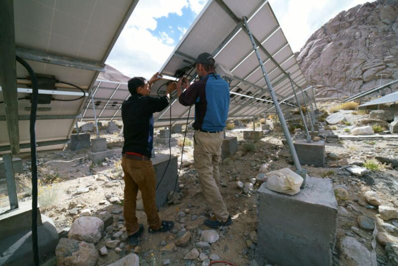 (Above): Solar engineers are seen repairing some solar panels at the Tangste power plant in Ladakh, India, Sept. 2016. (Rahul Ramachandram/Shutterstock)