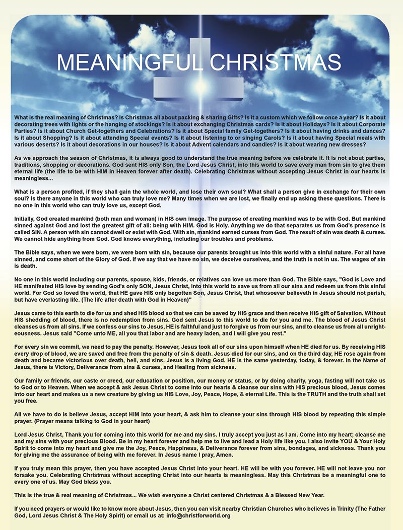 If you need prayers or would like to know more about Jesus, then you can visit nearby Christian Churches who believes in Trinity (The Father God, Lord Jesus Christ & The Holy Spirit) or email us at: info@christforworld.org