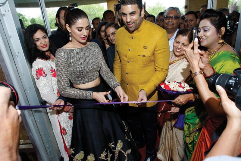 Nargis Fakhri and Saurabh Gadgil (l) cut the ribbon to enter the flagship PNG Jewelers showroom in Sunnyvale, Calif. (Som Sharma/Digital iVision Photograpy)