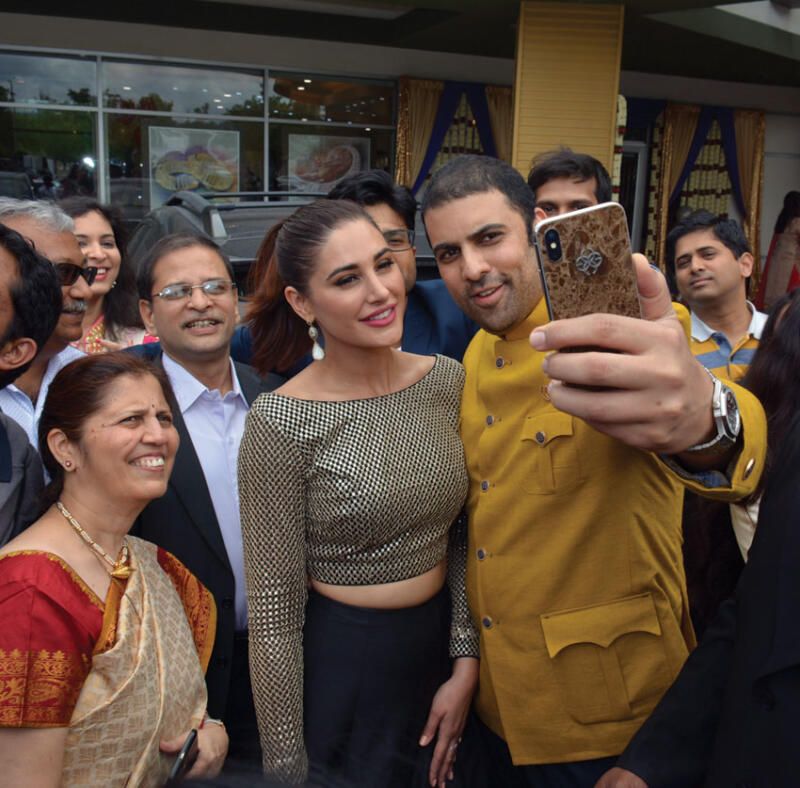 Nargis Fakhri and Saurabh Gadgil pose for a selfie outisde PNG Jewelers showroom in Sunnyvale, Calif.