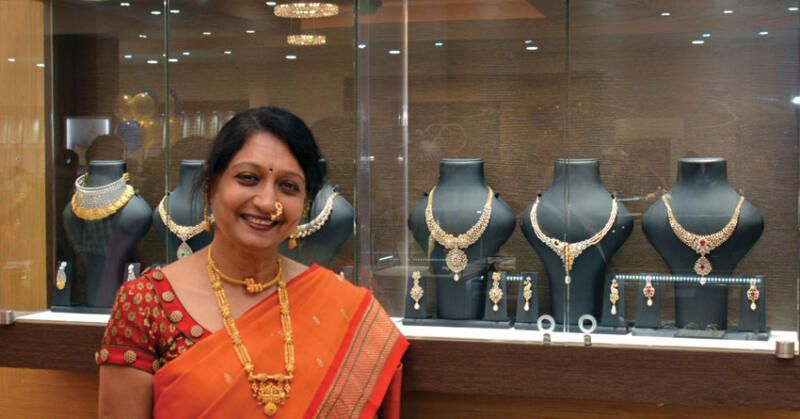 Jyoti Gadodia (l) shows a dazzling display of jewelry sets.