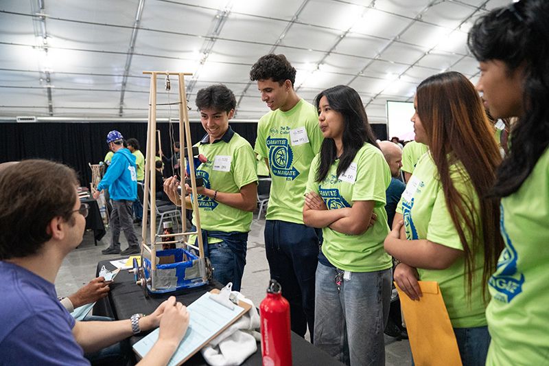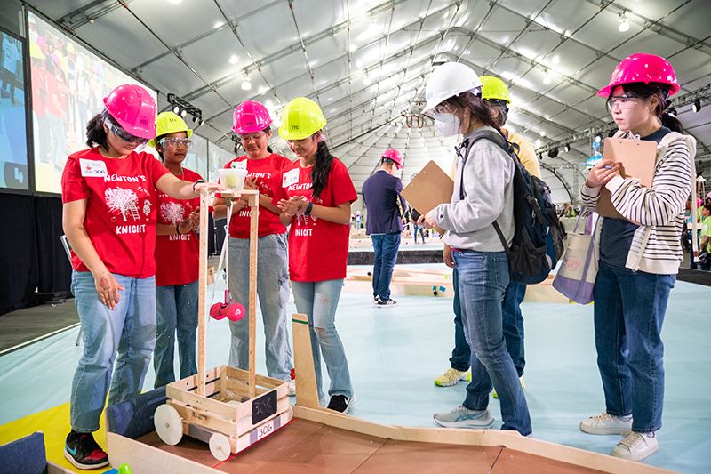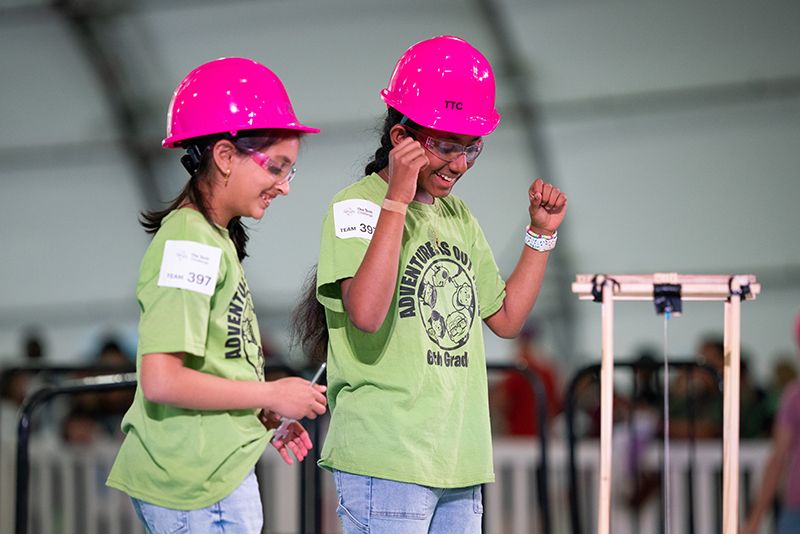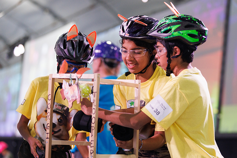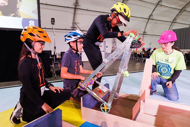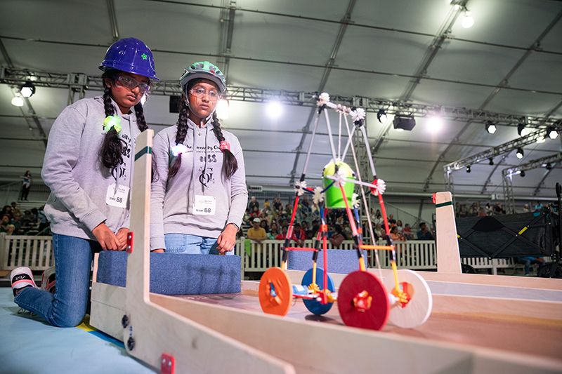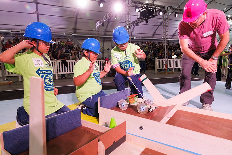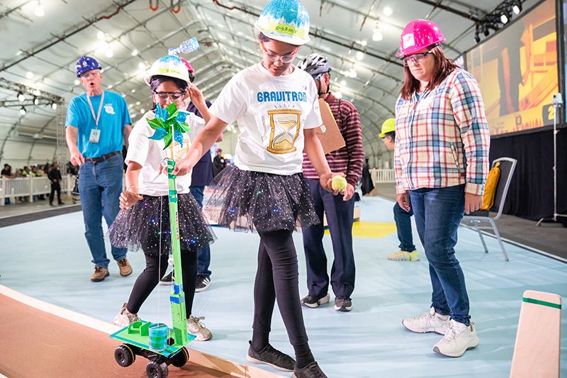 More than 600 teams participated in this year’s challenge, “Gravitate to Navigate,” which tasked them with building a gravity-powered device capable of traversing multiple tracks—forward and back. Each team was required to build a single gravity powered device to complete four successful runs while carrying a tennis ball payload.. Many teams creatively incorporated found materials andelements like wheels, axles, and pulleys.