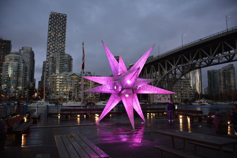 An art installation in front of the Vancouver skyline seen from the Granville Island Public Market (Janam A. Gupta/Siliconeer).