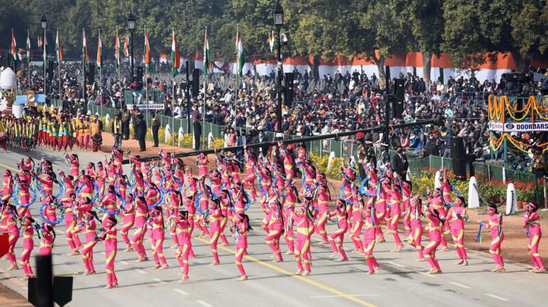 The school children perform at Rajpath, during the 72nd Republic Day Celebrations, in New Delhi on January 26, 2021.