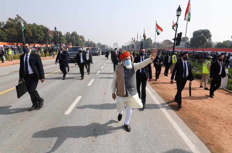 The Prime Minister, Shri Narendra Modi at Rajpath, during the 72nd Republic Day Celebrations, in New Delhi on January 26, 2021.