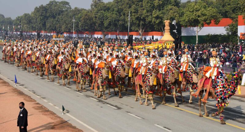 The Border Security Force (BSF) Camel Contingent passes through the Rajpath, at the 72nd Republic Day Celebrations, in New Delhi on January 26, 2021.