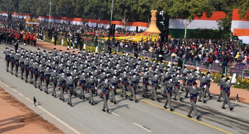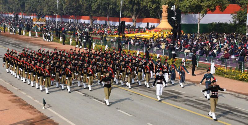 The National Cadet Corps (NCC) Girls Marching Contingent passes through the Rajpath, at the 72nd Republic Day Celebrations, in New Delhi on January 26, 2021.