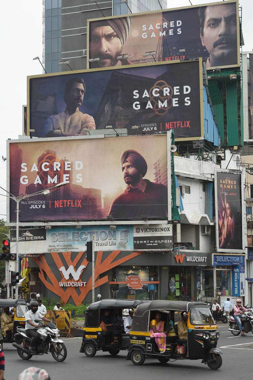 Indian commuters travel past large billboards for “Sacred Games”, the upcoming Indian series on Netflix, in Mumbai. – Netflix’s first original Indian series released on July 6 as the US streaming giant battles with Amazon Prime for a slice of India’s fast-growing on-demand video market. (Indranil Mukherjee/AFP/Getty Images)